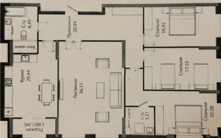 Современная планировка: кухня-гостиная и три изолированные комнаты, два санузла (ванна и душевая).