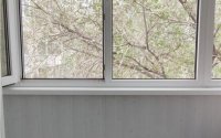 Балкон остеклен пластик на полу ламинат, обшит панелями С одной стороны шкаф. .