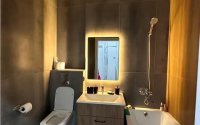 Современная ванная: стеклянная перегородка, дорогая сантехника