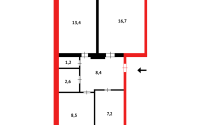 Общая площадь 59 кв.м, раздельная планировка.