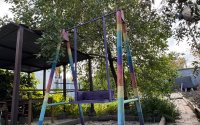 На заднем дворе большая качеля и просторная беседка, увитая виноградниками — отличное место для отдыха всей семьи.