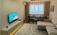 Большая кухня 14 м² с дорогой мебелью, гостиная 25 м² с зоной столовой, 2 изолированные спальни (мастер-спальня с гардеробной 4 м²), 2 санузла, 2 лоджии, прачечная 4 м². Продаётся с мебелью и техникой, входная дверь итальянская, межкомнатные двери Profildoors, встроенная мебель Inzhu, техника Bosch и Hansa, немецкий ламинат Classen, качественная электропроводка Schneider.