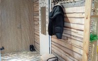 В прихожей — стильные обои и удобный стеллаж.