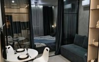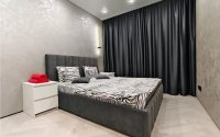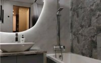 Кухня-студия, стеклянная перегородка к спальне. Двери в гардероб, ванную и детскую скрытого монтажа. Ванная с ванной из искусственного камня, подвесным унитазом, водонагревателем и скрытой вытяжкой. Есть датчики протечки воды и пожарные датчики.