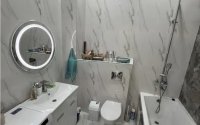 Санузел совмещён, оформлен в спокойных оттенках, установлена качественная сантехника.