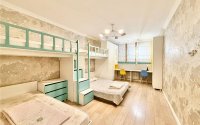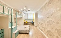 В детской — двухъярусная кровать, встроенные шкафы и стеллажи.