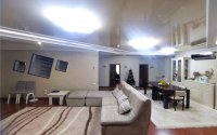 Гостиная влюбляет в себя своим авторским дизайном. Разделена на две зоны, где в одной части можно комфортабельно встречать гостей, а в другой насладиться семейным просмотром домашнего кинотеатра.