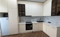 В кухне встроенный холодильник, встроенная посудомойка, гарнитур из МДФ.