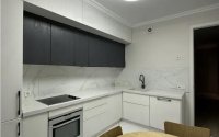На кухне встраиваемая техника, столешница из искусственного камня, посудомоечная машина.