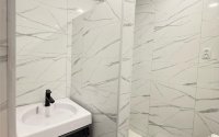 Большой санузел, в котором имеется тропический душ.