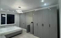 Кровать с подъёмным механизмом 1, 80 на 2, Прикроватные тумбы, 4- дверный шкаф, тв зона, навесные полки, косметический стол с зеркалом, раскладной диван, гардеробная.