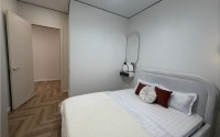 В квартире потолки 3 метра, пол выполнен укладкой ёлочка, в гостиной декоративные бамбук-панели. Кухня из МДФ со встроенной техникой Samsung и встроенным холодильником, спальня оборудована шкафом из МДФ. Есть большой балкон, окна с тройным остеклением и подготовка под кондиционер.