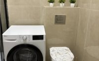 Квартира полностью укомплектована: установлена новая душевая кабина, качественная инсталляция с унитазом Grohe, стиральная машина на 9 кг, варочная поверхность с вытяжкой и отдельной духовкой. Также предусмотрены два вместительных шкафа до потолка — удобное решение для хранения.