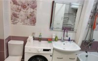 Кухня полностью выложена плиткой до потолка, санузел совмещённый — также в плитке.