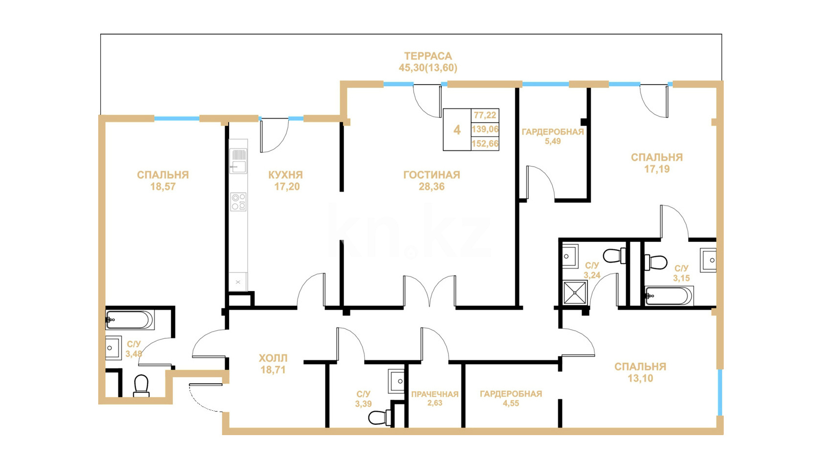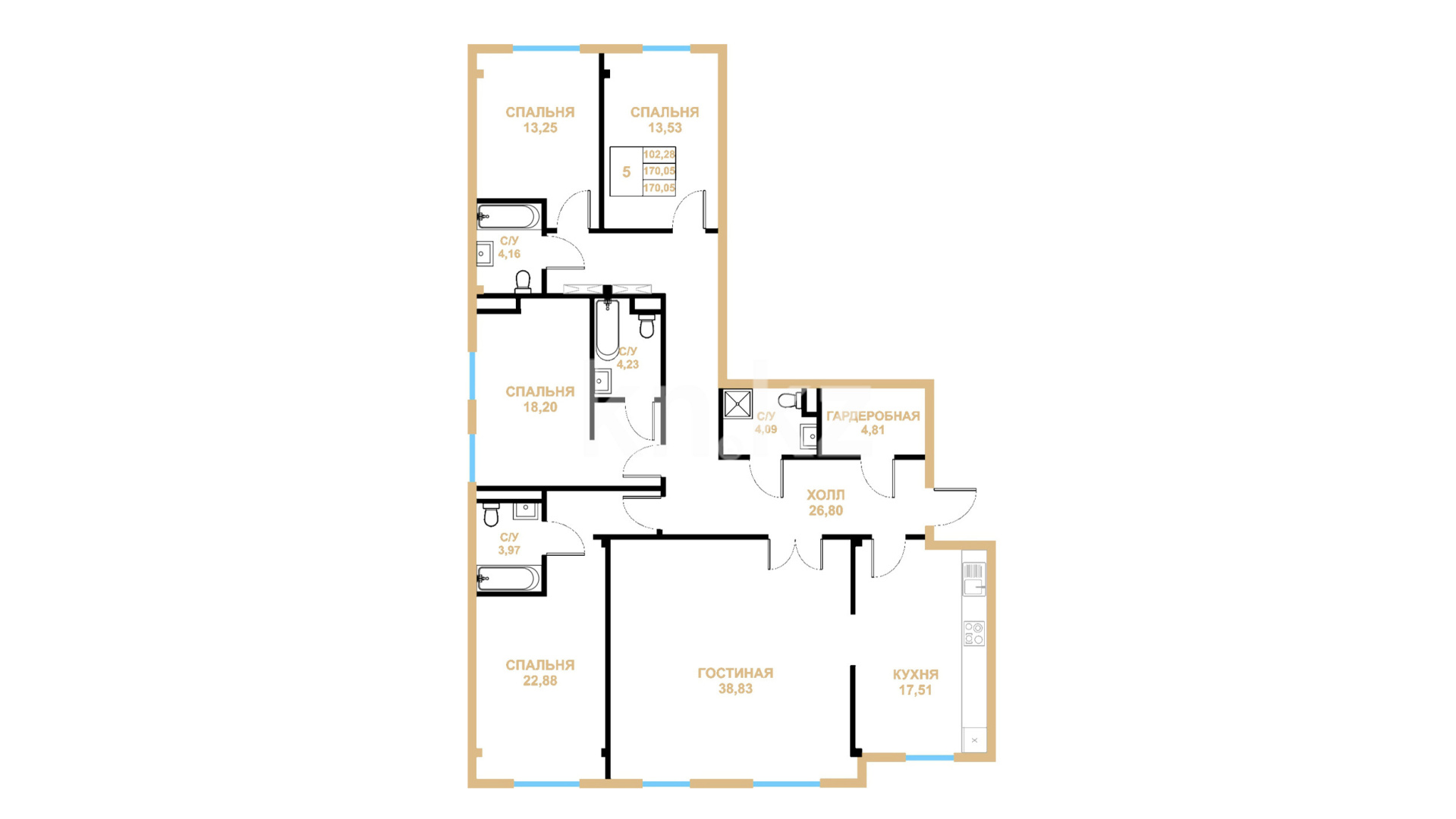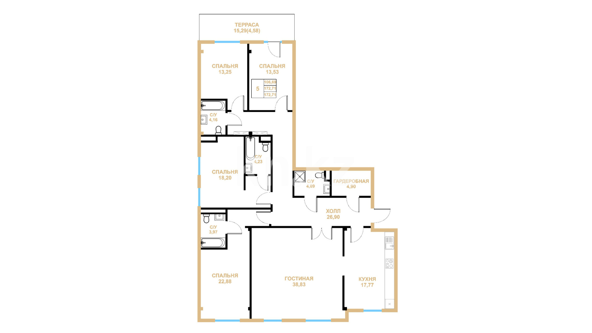 В комплексе представлены различные планировки 2-, 3-, 4- и 5-комнатных квартир. Минимальная площадь - 76 кв. метров и самая большая площадь - 350 кв. метров.
