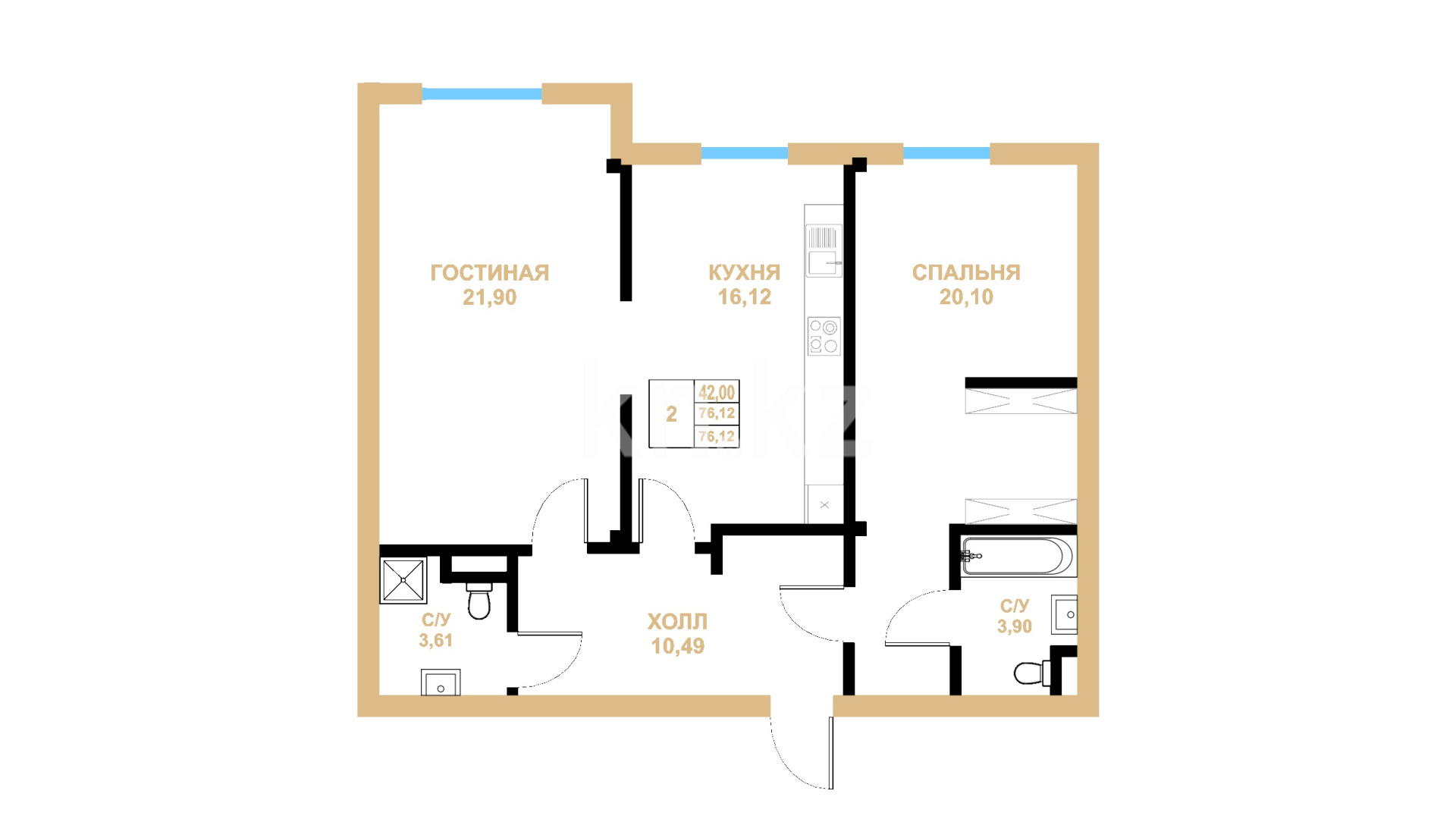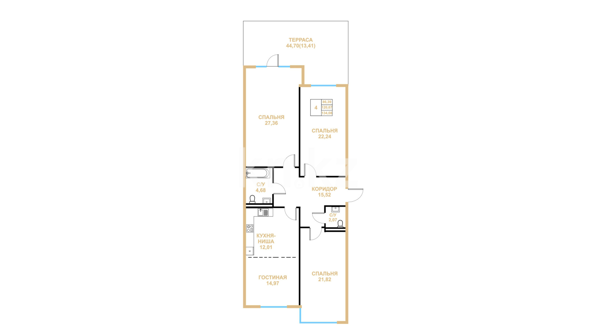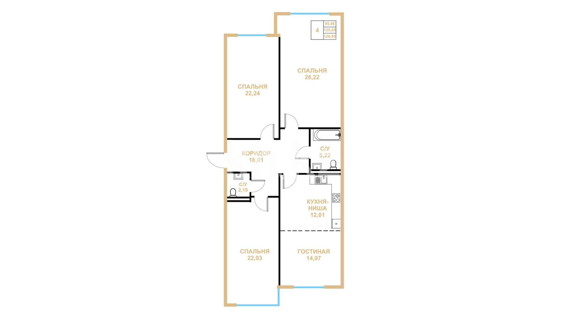 В комплексе представлены различные планировки 2-, 3-, 4- и 5-комнатных квартир. Минимальная площадь - 76 кв. метров и самая большая площадь - 350 кв. метров.
