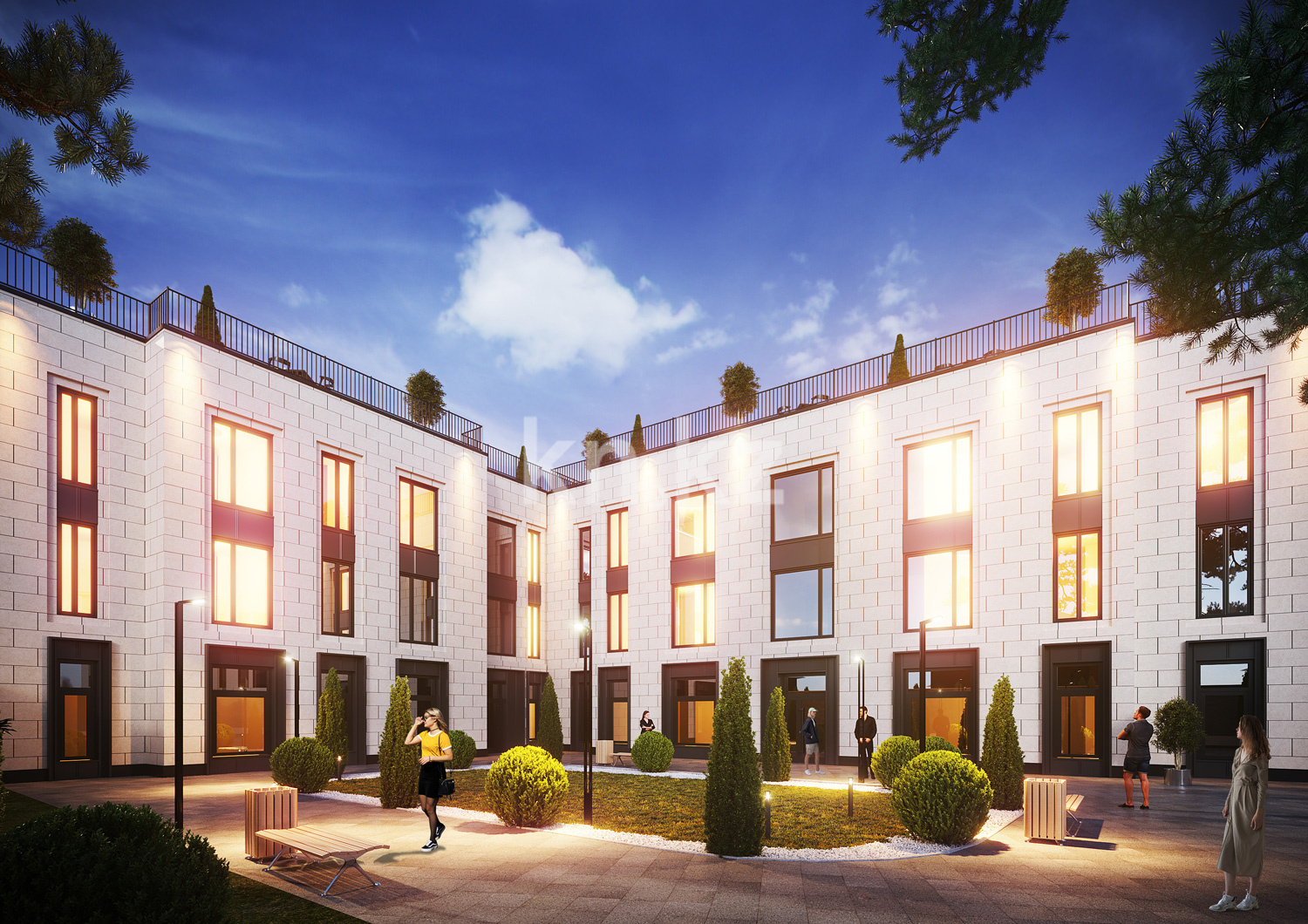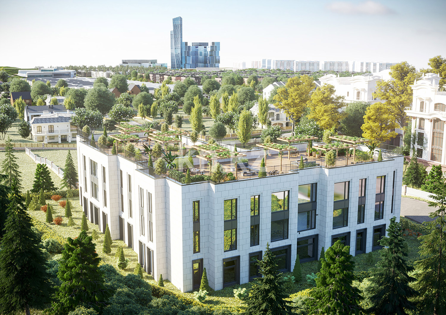КД Esentai terrace – трехэтажный дом элит-класса, спроектированный в стиле неоклассика. Фасад, выполнен в светлых оттенках. На крыше обустраивается общая зона отдыха площадью 600 кв. метров, оборудованная беседками, перголами и зоной барбекю. На террасе высаживаются редкие растения и кустарники.