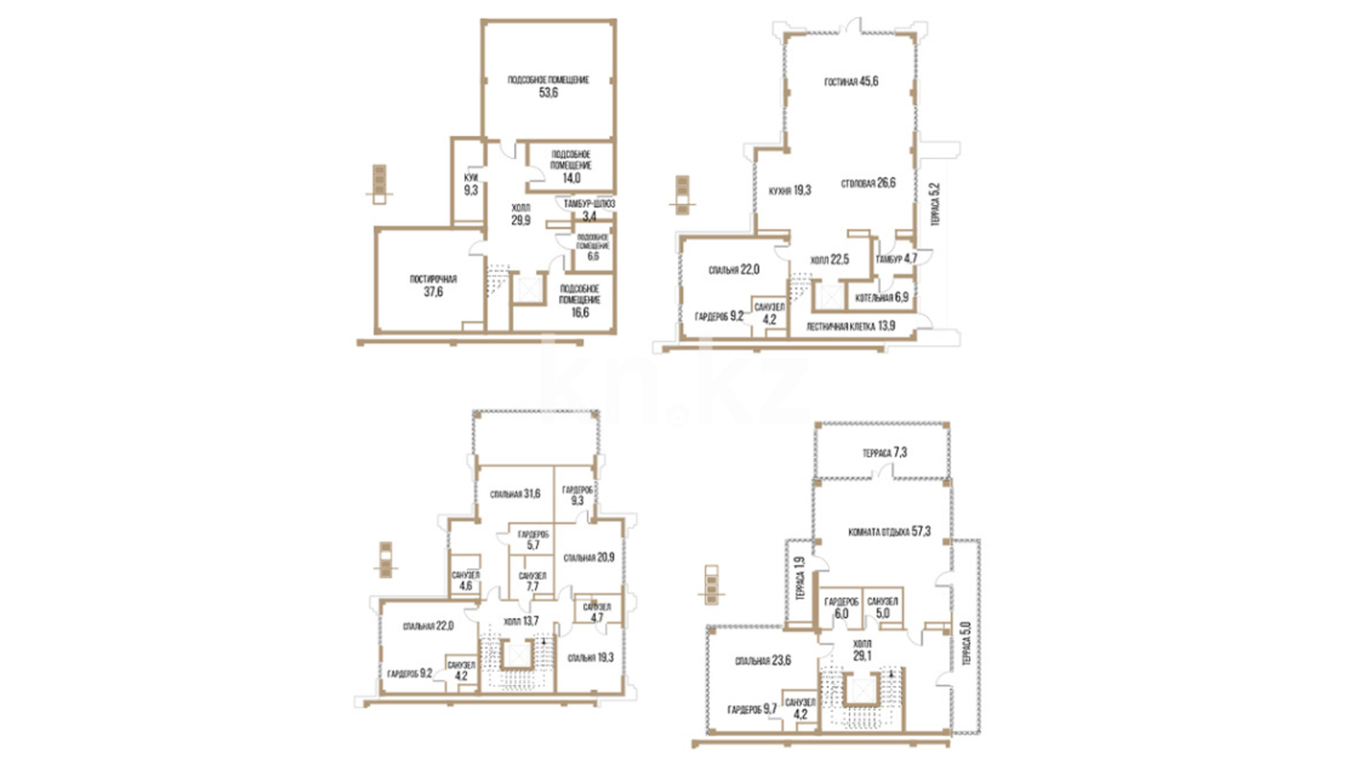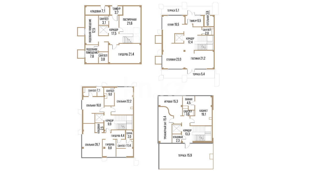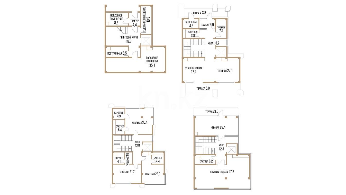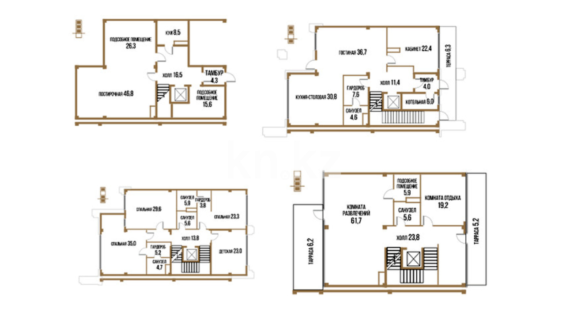 Каждый таунхаус представляет собой просторное помещение площадью от 294 кв. метров, с гардеробными, несколькими санузлами, подсобными комнатами, котельной, кухней-столовой и уютной гостиной. В зависимости от планировки, предусмотрено от 5 до 11 спален, а также минимум одна терраса площадью от 5 кв. м, что идеально подходит для отдыха на свежем воздухе.