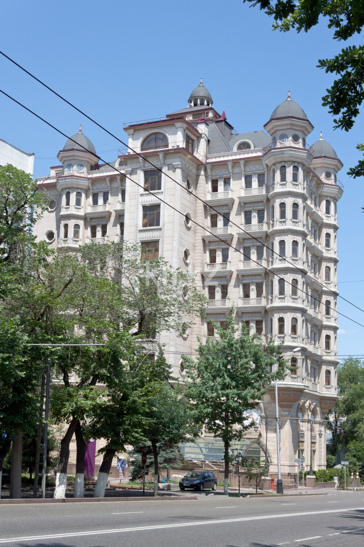 Дом поражает своим экстерьером. Больше всего он напоминает замок. Этому способствуют выступающие эркеры, круглые башни, заканчивающиеся куполами с остроконечными шпилями, и роскошная отделка травертином.