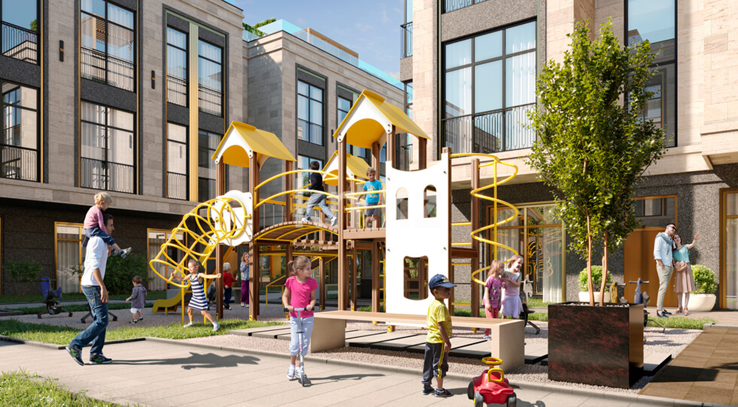 детские игровые площадки с качелями и горками;