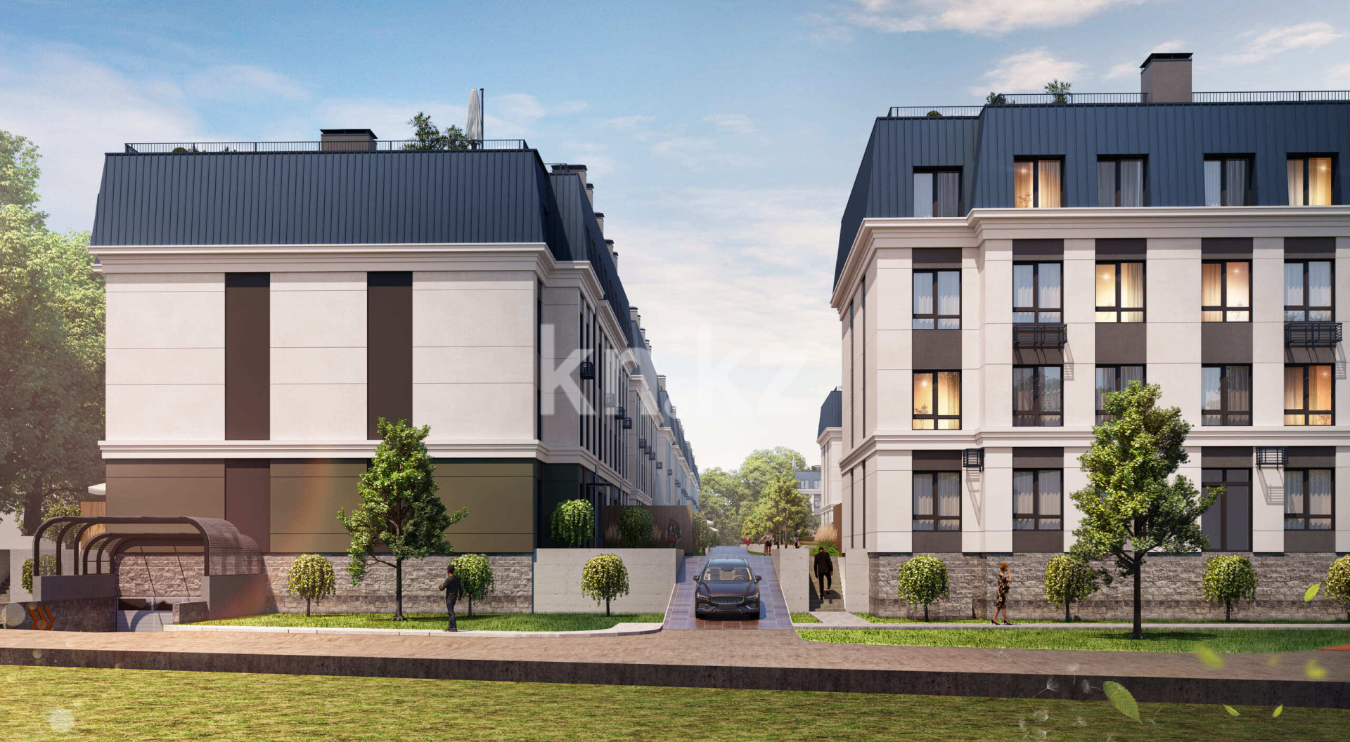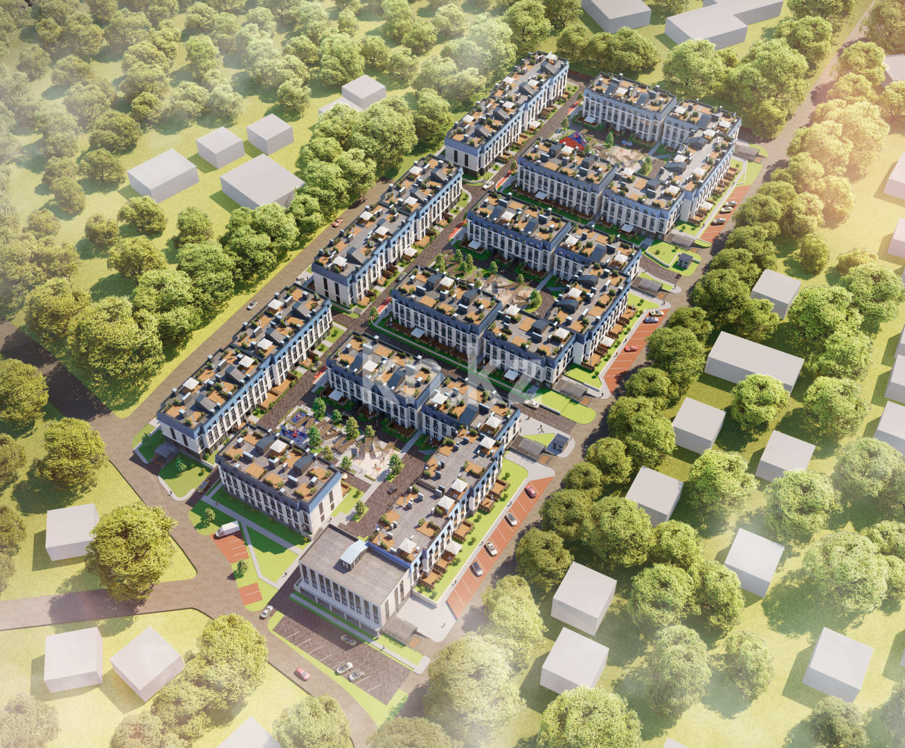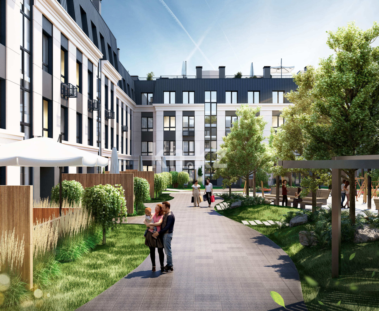 Комплекс образует три отдельные дворовые зоны, соединенные пешеходной аллеей с зонами отдыха. Весь автомобильный трафик вынесен за пределы дворов, что обеспечивает тишину и безопасность для жителей. Территория комплекса находится под круглосуточной охраной и видеонаблюдением.