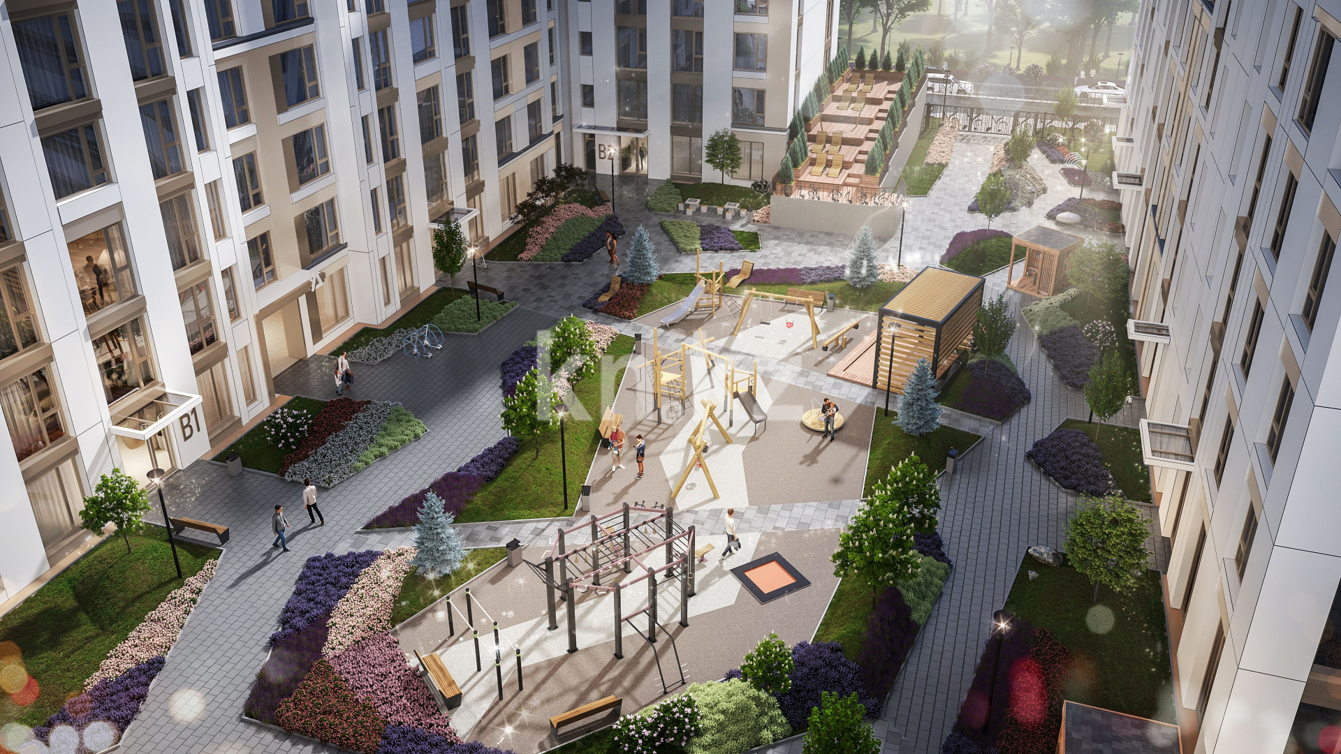 Территория комплекса спроектирована в концепции «двор без машин», что обеспечивает безопасность и комфорт для жителей.