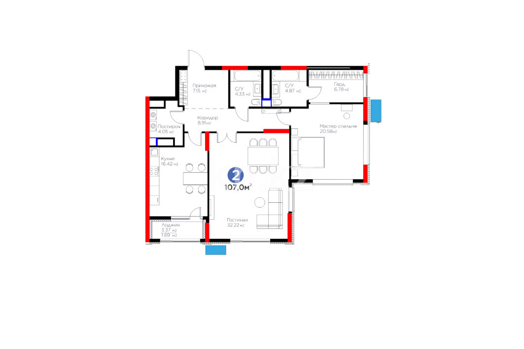 Высота потолков: 3.3 м
