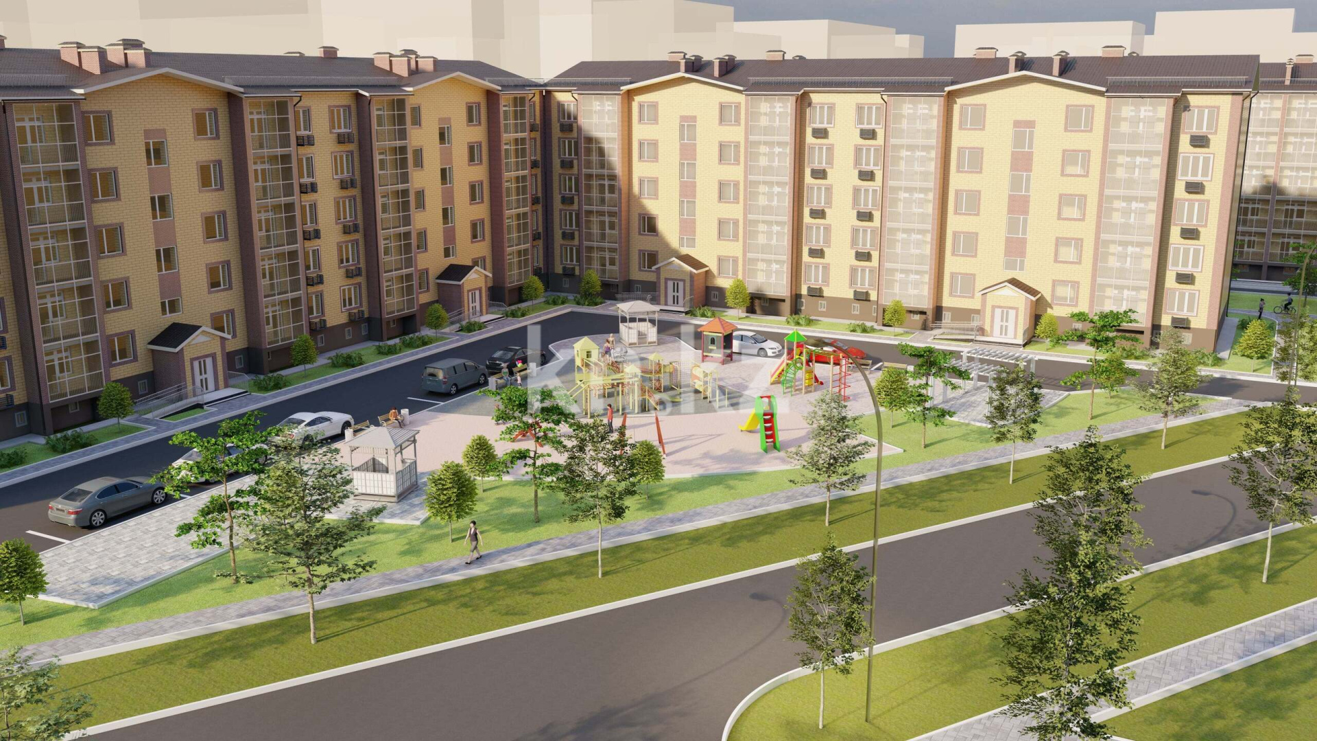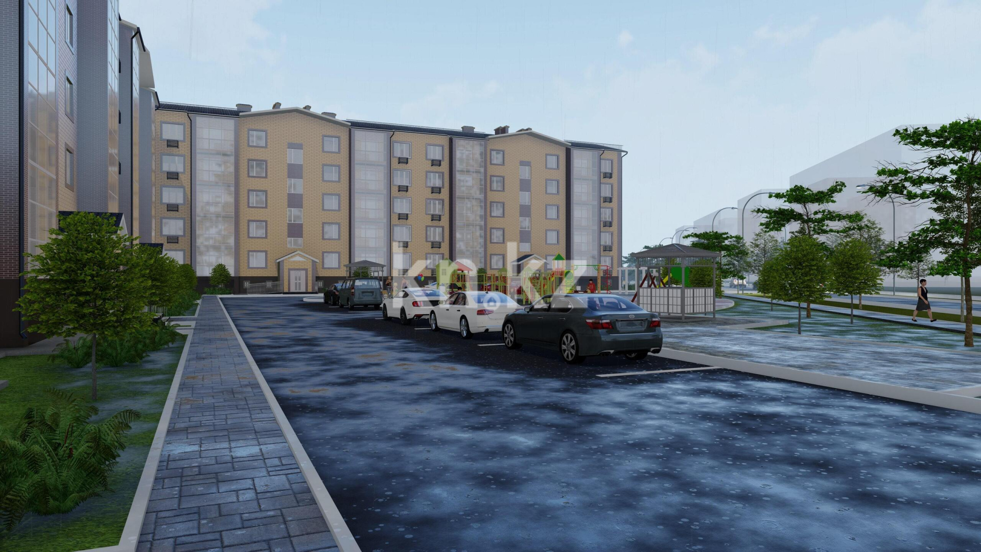 детская игровая площадка, оборудованная качелями, горками и песочницами;