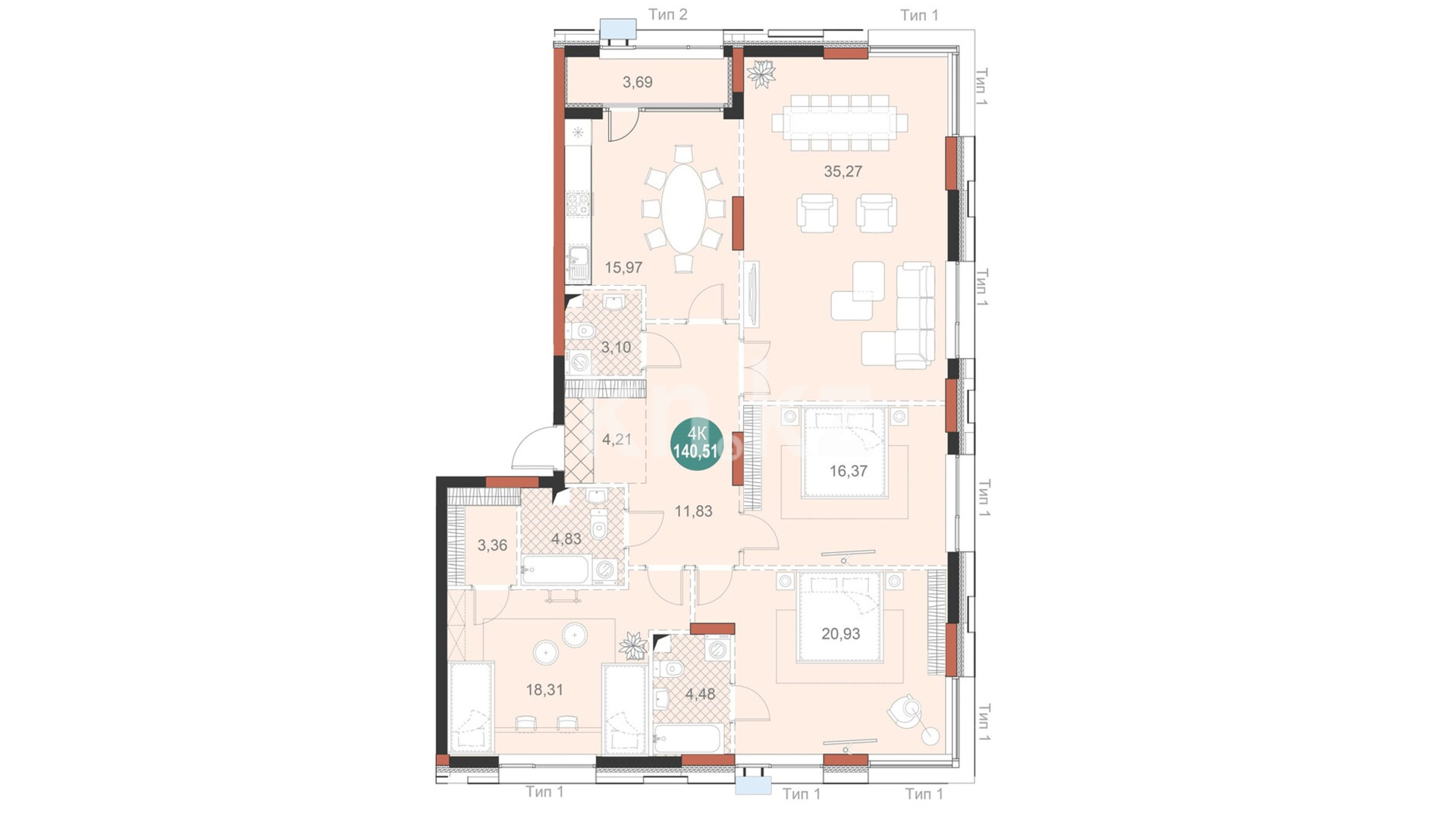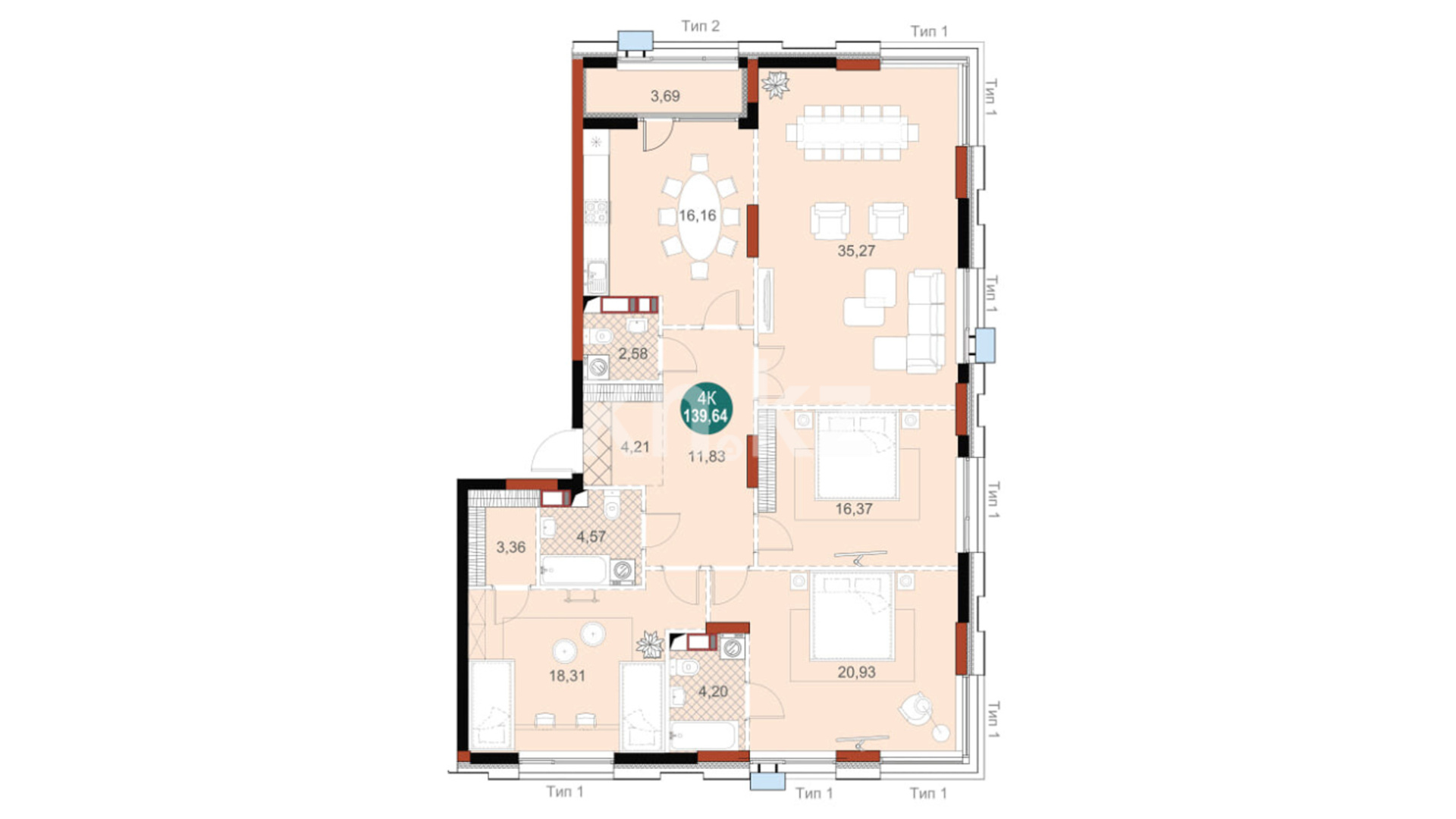 Mangilik Park — это жилой комплекс бизнес-класса, выполненный в современном архитектурном стиле с использованием качественных и долговечных материалов. Здания имеют монолитно-каркасную конструкцию с газоблоками, утеплены и облицованы клинкерной плиткой и HPL-панелями, что придаёт им презентабельный и строгий внешний облик. Комплекс состоит из четырёх блоков высотой 12–13 этажей. Квартиры представлены в различных планировках — от компактных однокомнатных до просторных четырехкомнатных, площадью от 43 до 140 квадратных метров. Высота потолков — 3 метра, на первом и последнем этажах — до 3,3 метров, а большие панорамные окна наполняют помещения естественным светом и открывают красивые виды на город и канал. В каждой секции предусмотрены современные лифты, установлены системы видеонаблюдения, работают охрана и домофоны. Поддержка безопасности реализована на высоком уровне — вход по Face ID и Touch ID, электронные замки и огороженная территория создают ощущение защищённости и уюта.