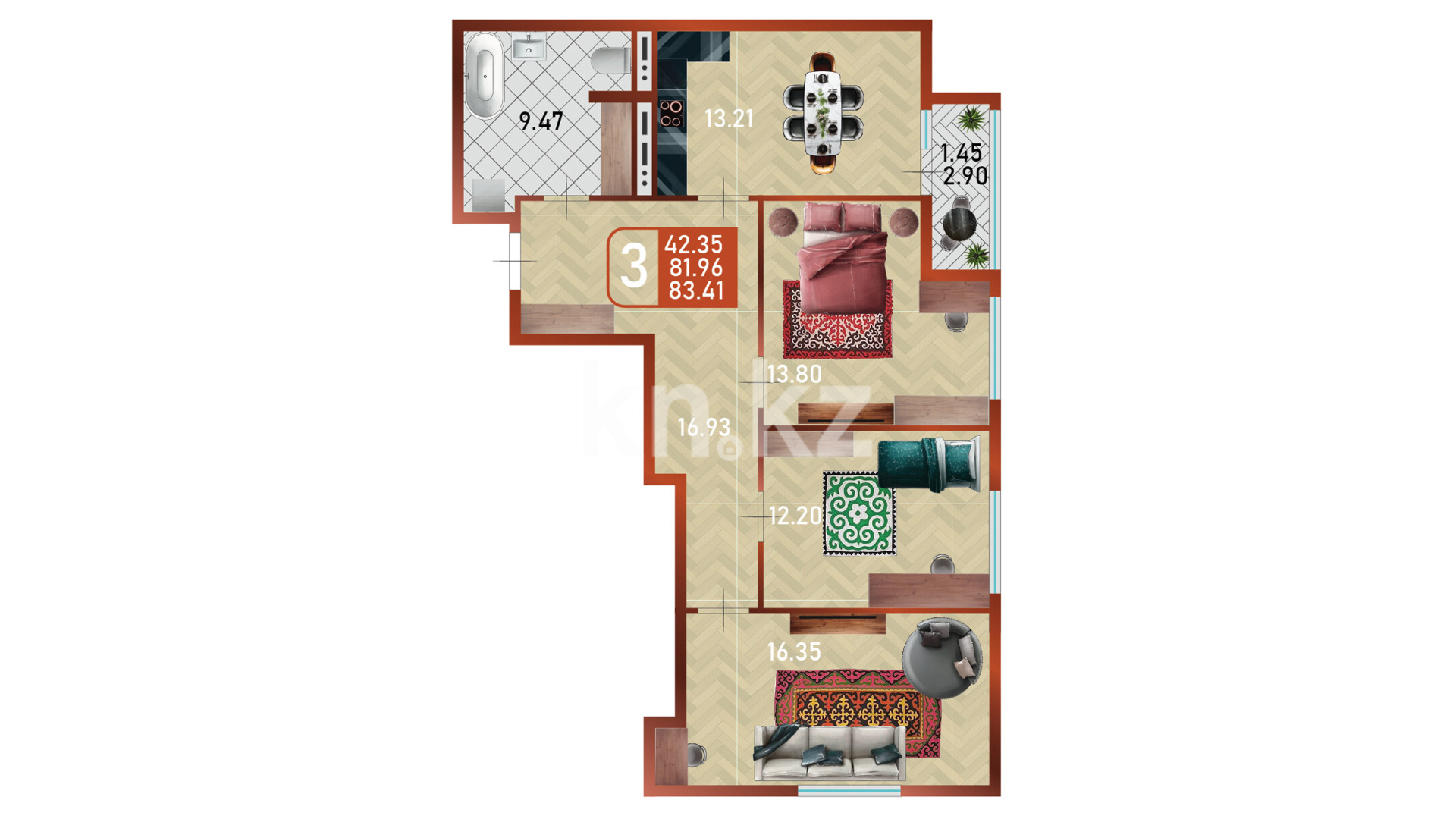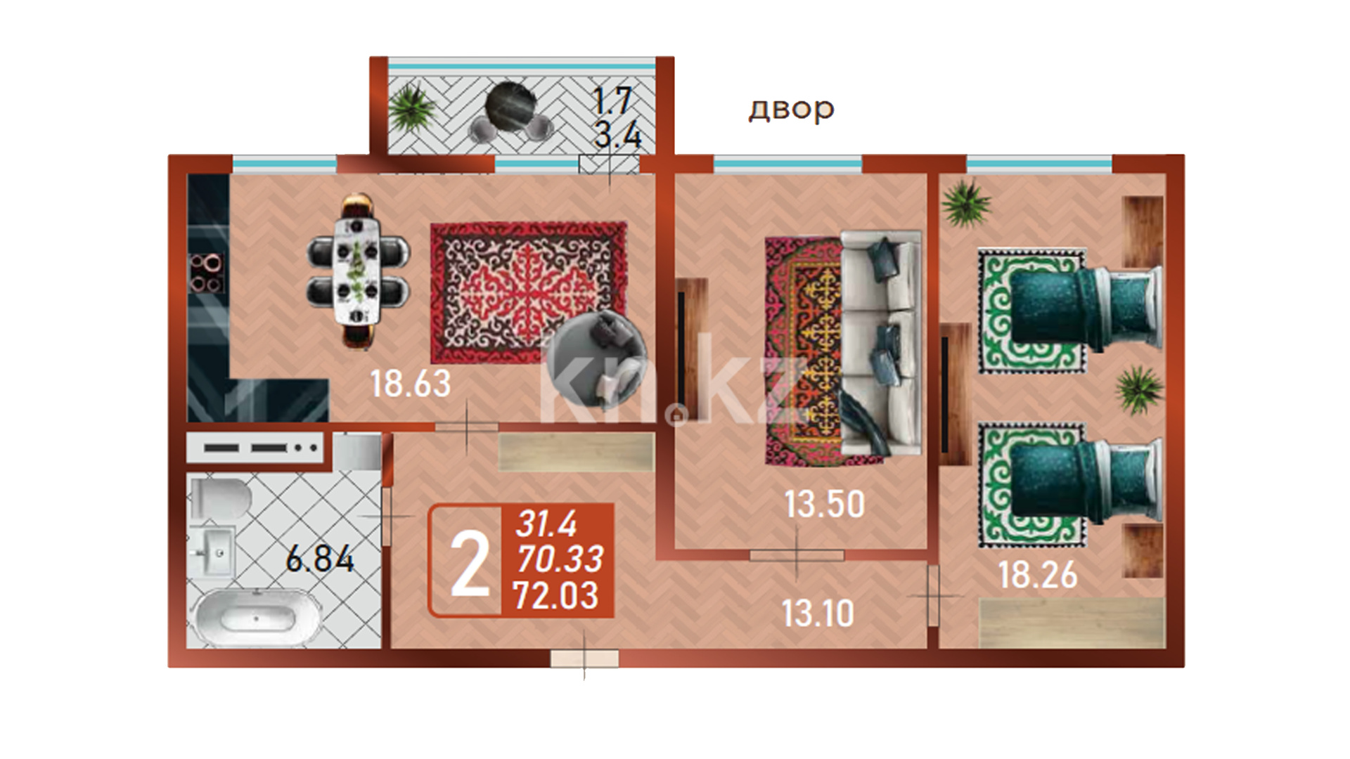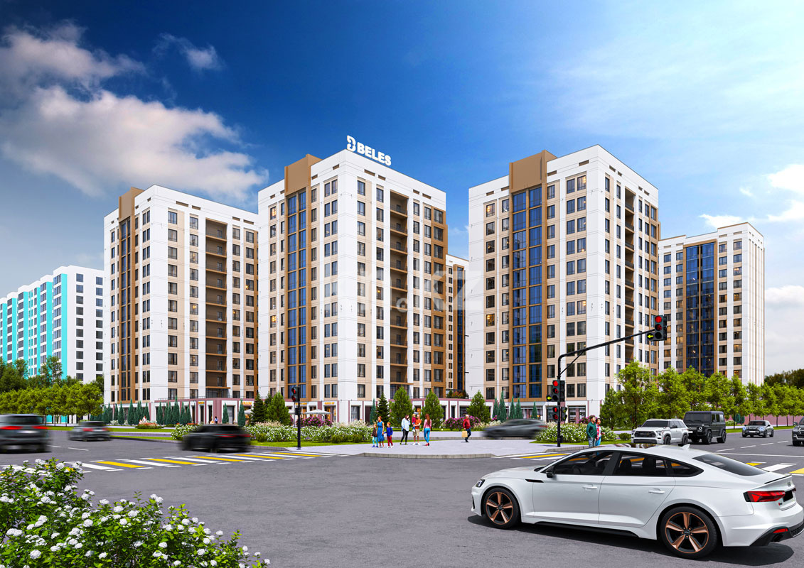 Его дома монолитные, 14 этажей, с черновой (базовой) отделкой, высота потолков — 3 метра. В квартирах предусмотрены большие окна (примерно 2,1 м), что делает помещения светлыми и просторными. Архитектурная концепция комплекса сочетает современные решения с национальным характером — фасады выстроены в актуальном стиле, а холлы оформлены с этно-элементами, придающими пространству особую атмосферу и уют.