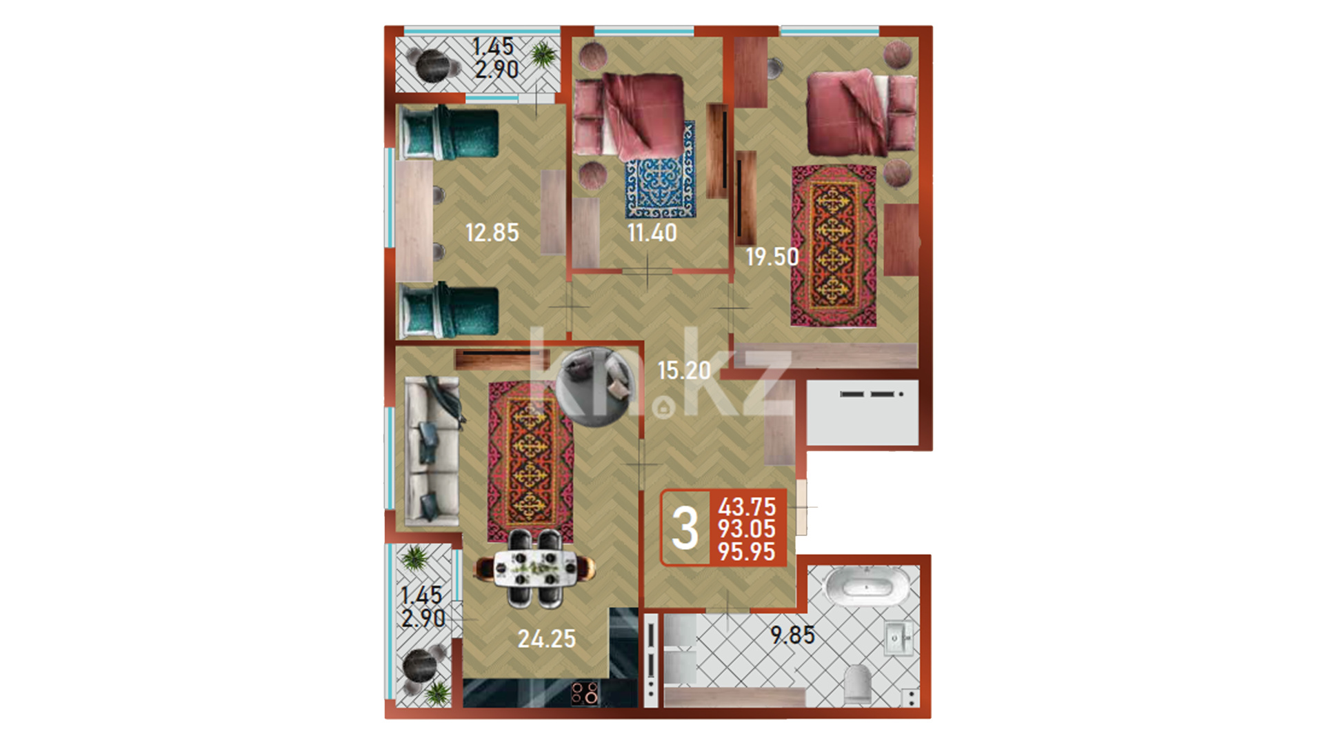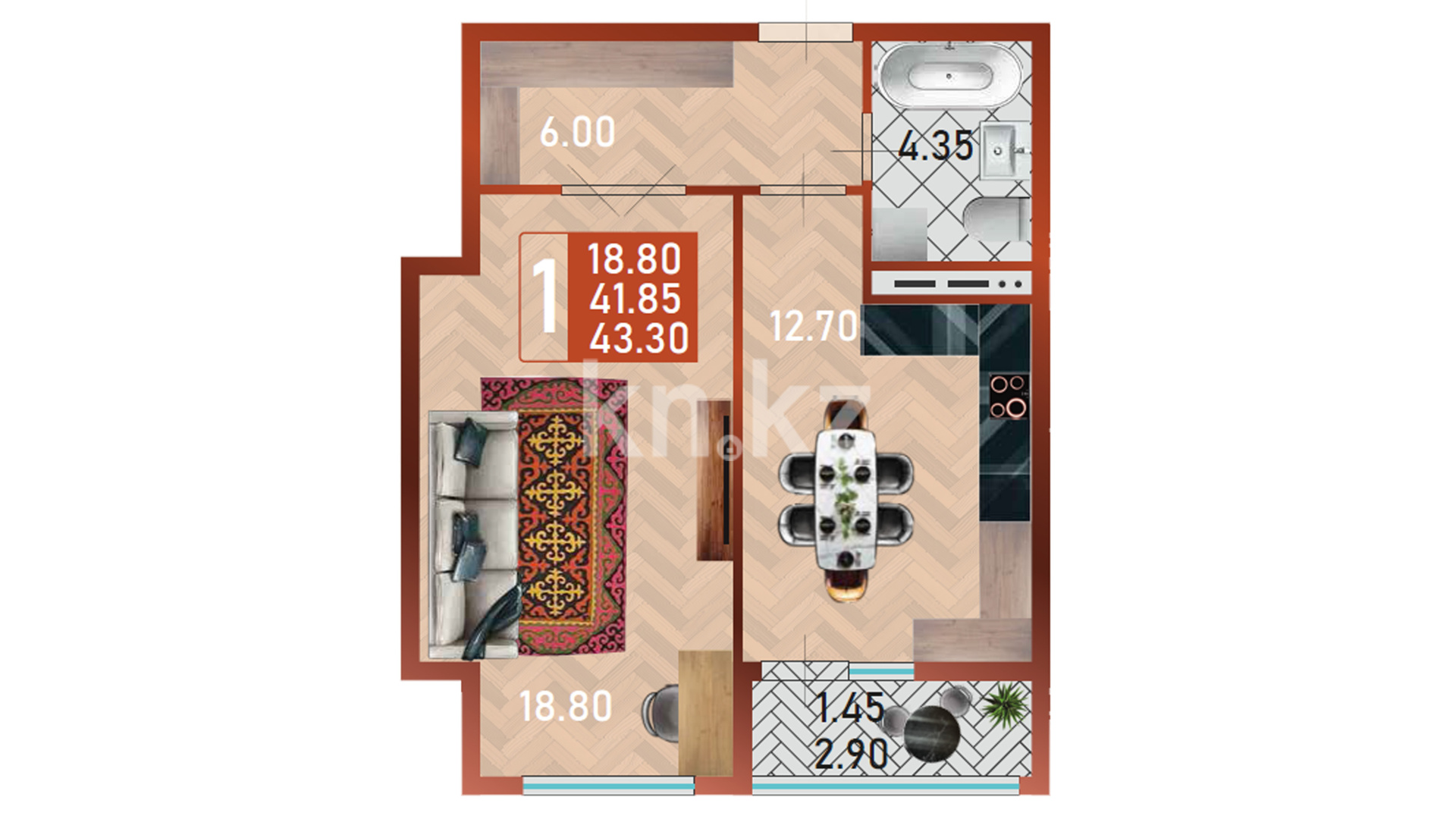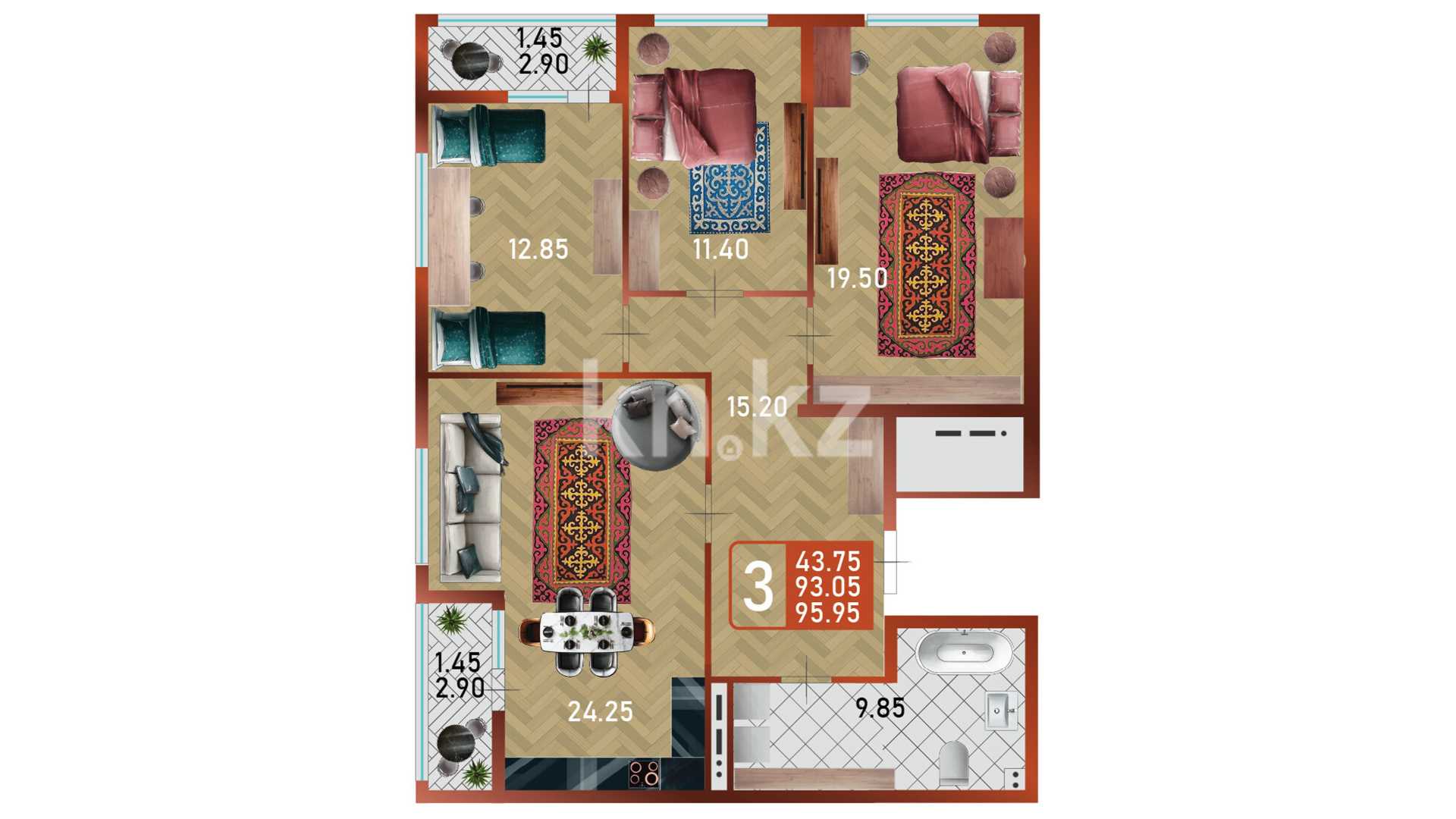 Его дома монолитные, 14 этажей, с черновой (базовой) отделкой, высота потолков — 3 метра. В квартирах предусмотрены большие окна (примерно 2,1 м), что делает помещения светлыми и просторными. Архитектурная концепция комплекса сочетает современные решения с национальным характером — фасады выстроены в актуальном стиле, а холлы оформлены с этно-элементами, придающими пространству особую атмосферу и уют.