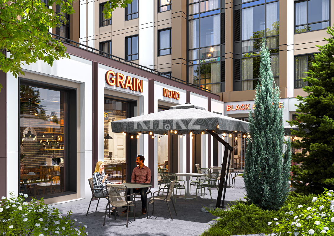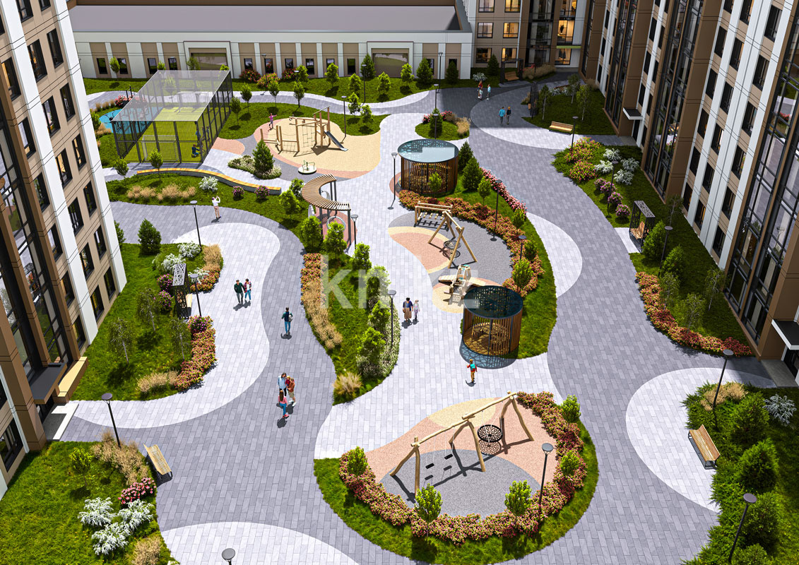 Благоустройство территории рассчитано на комфортную семейную жизнь: двор закрыт от машин, предусмотрены детские и спортивные площадки, зоны отдыха, что создаёт безопасную и дружелюбную для детей и взрослых среду. Для безопасности жильцов реализованы современные технологии: доступ в подъезд по Face ID/Touch ID, круглосуточная охрана и видеонаблюдение. Инфраструктура вокруг комплекса хорошо развита — в шаговой доступности находятся магазины, аптеки, супермаркеты, а также общественный транспорт, что делает проживание удобным и практичным как для семей, так и для людей без машины.