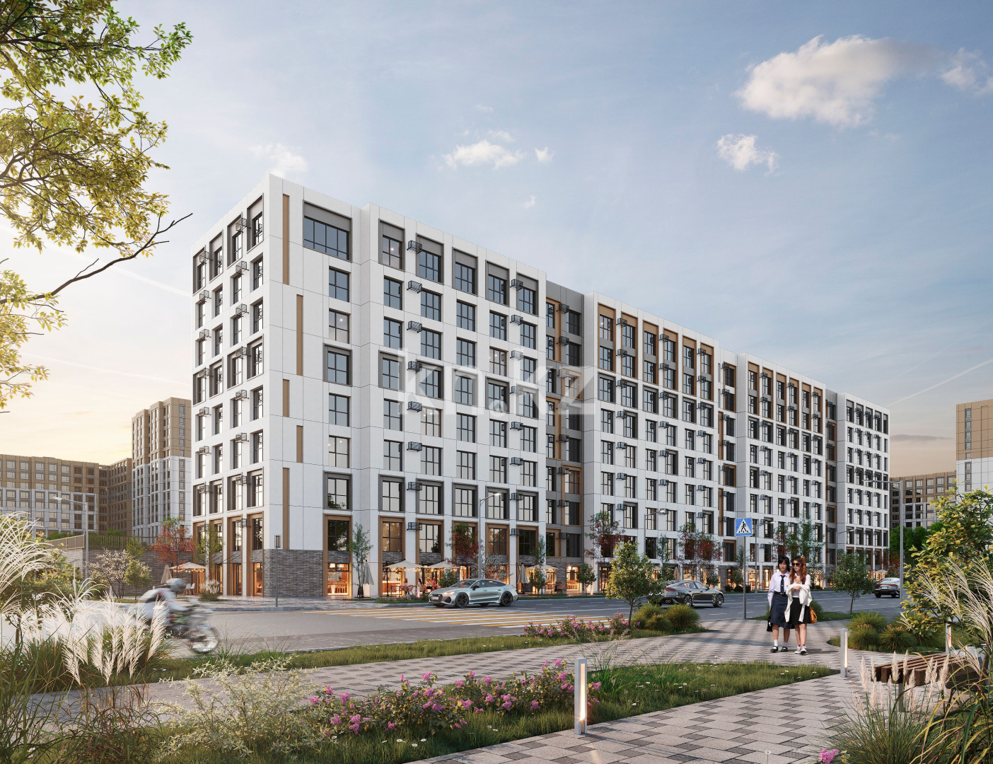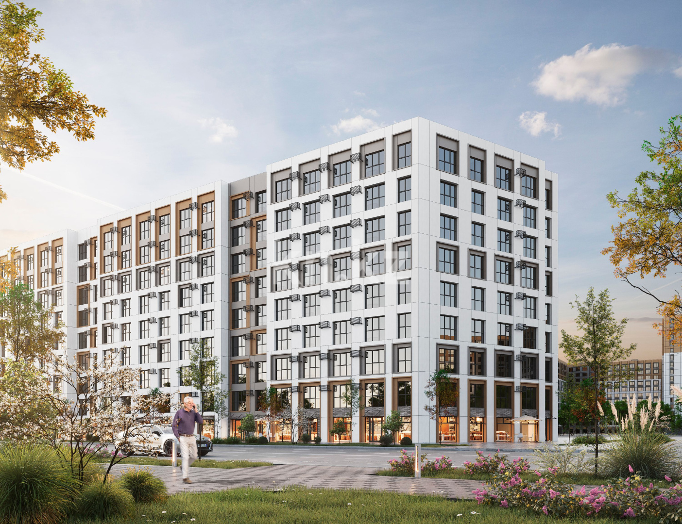 Фасады облицованы алюминиевыми композитными панелями, что придаёт зданиям современный и аккуратный внешний вид.