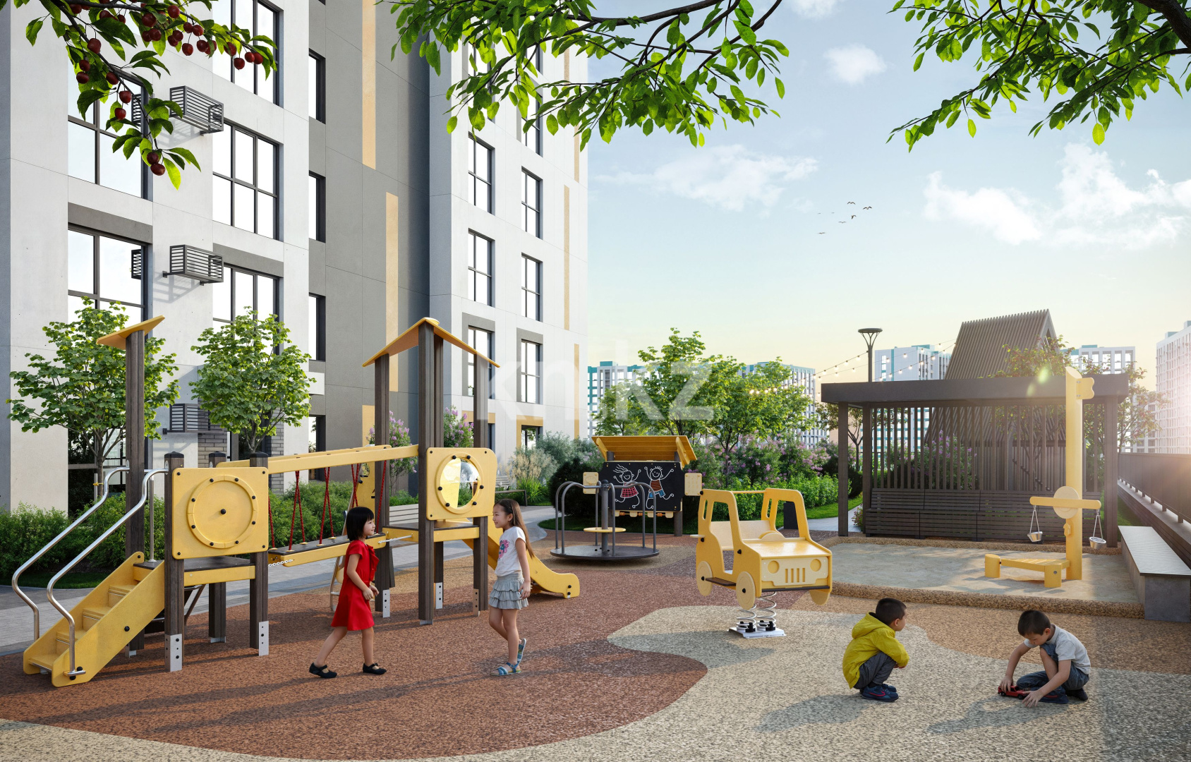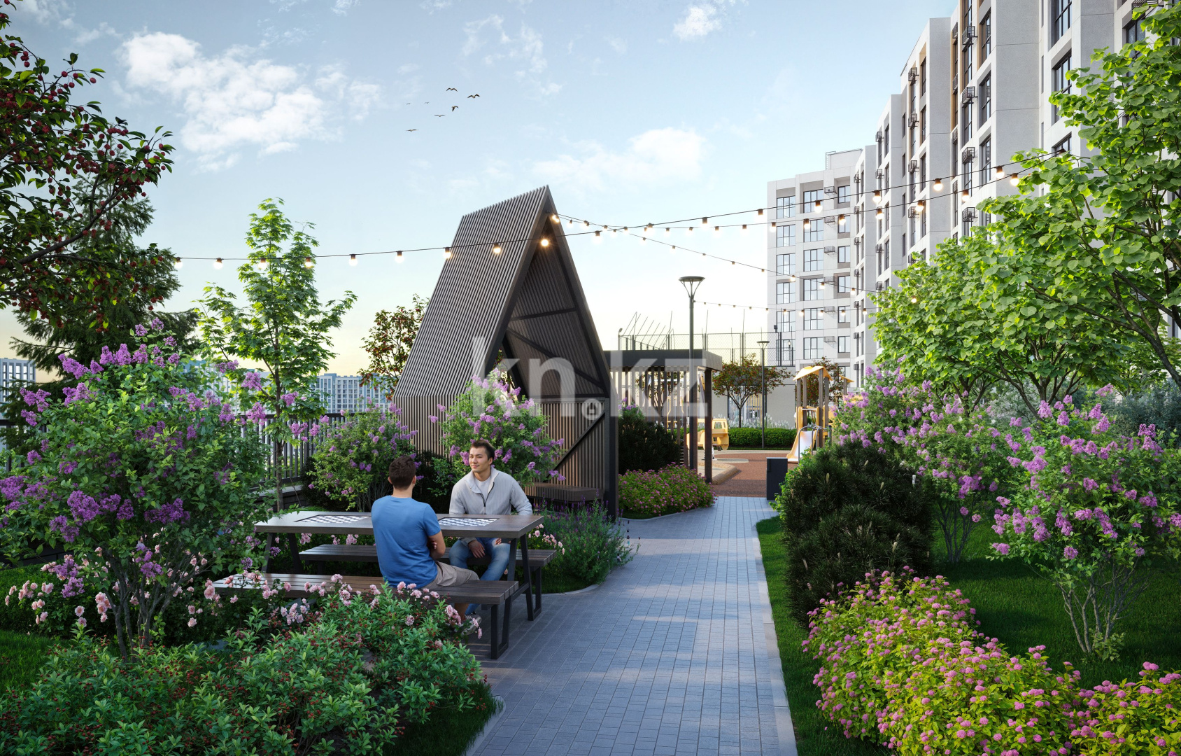 Зелёные насаждения защищают от ветра зимой и создают приятную прохладу летом, позволяя наслаждаться двором в любое время года.