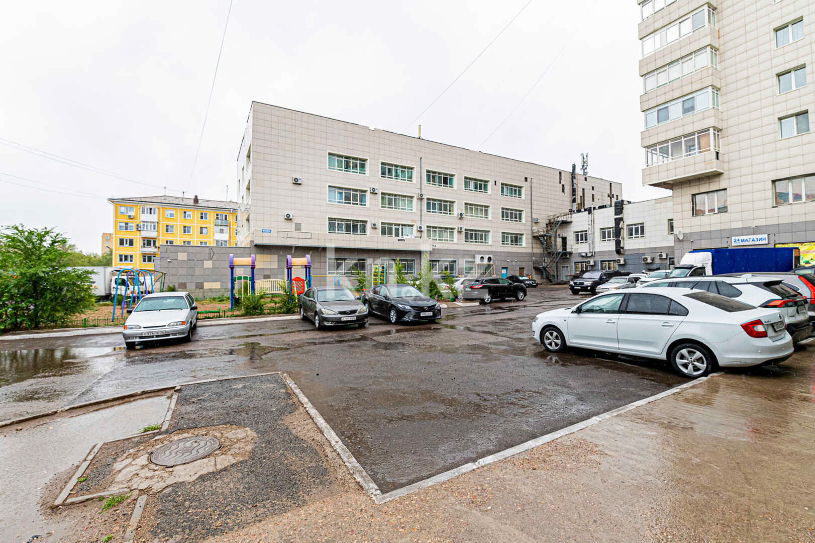 Дом не имеет собственного крытого паркинга. Во дворе находятся детская площадка, места для стоянки автомобилей.