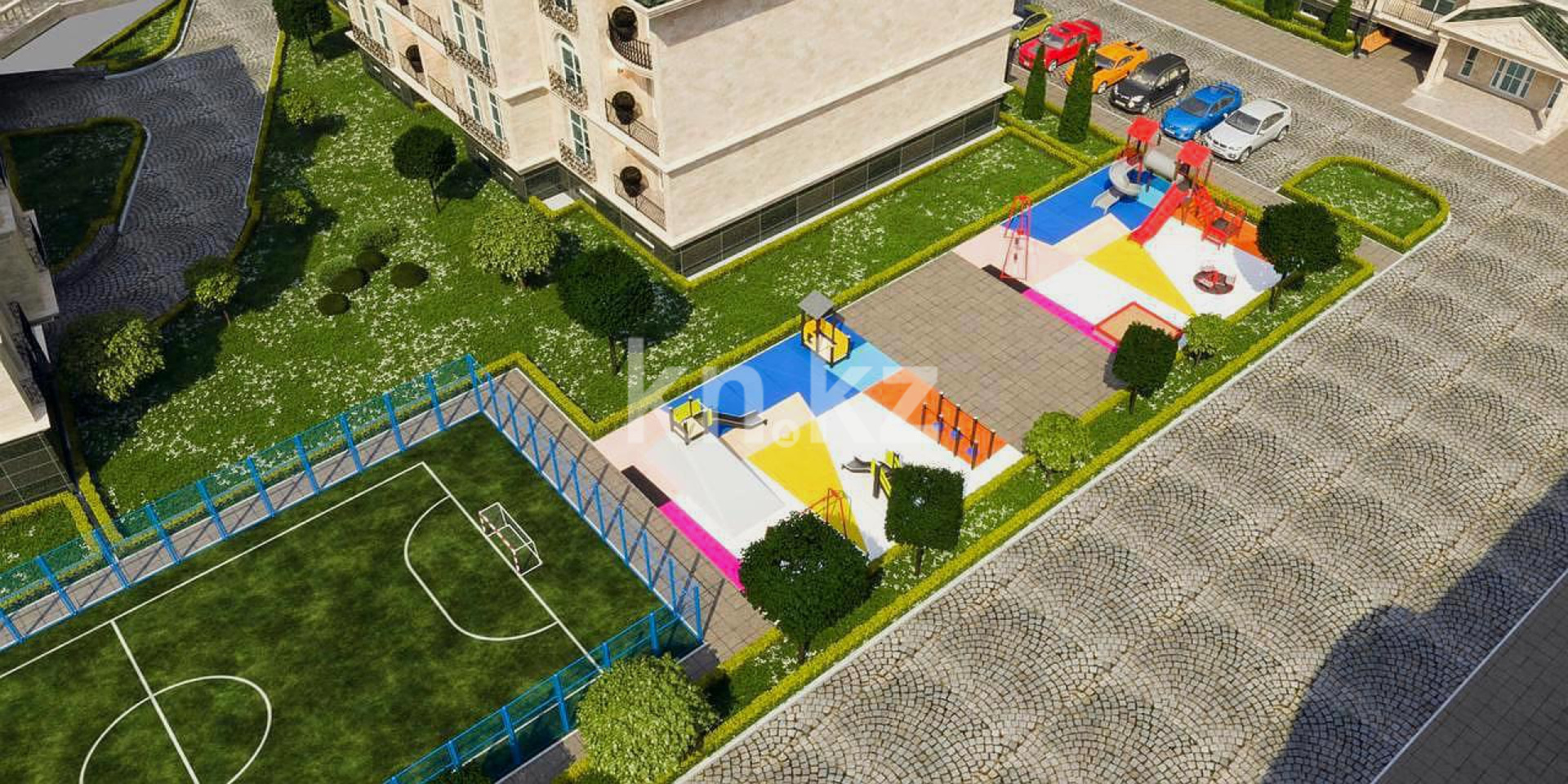 Территория комплекса закрыта и охраняется, оборудована системой видеонаблюдения. Для жителей предусмотрены три паркинга (подземный, наземный и гостевой) на 300 машиномест, детские и спортивные площадки, фонтаны, зоны отдыха, аллеи для прогулок и барбекю-зоны. Двор свободен от машин, что обеспечивает безопасность и комфорт. Архитектура комплекса вдохновлена европейским стилем и подчёркивает статусность проекта.