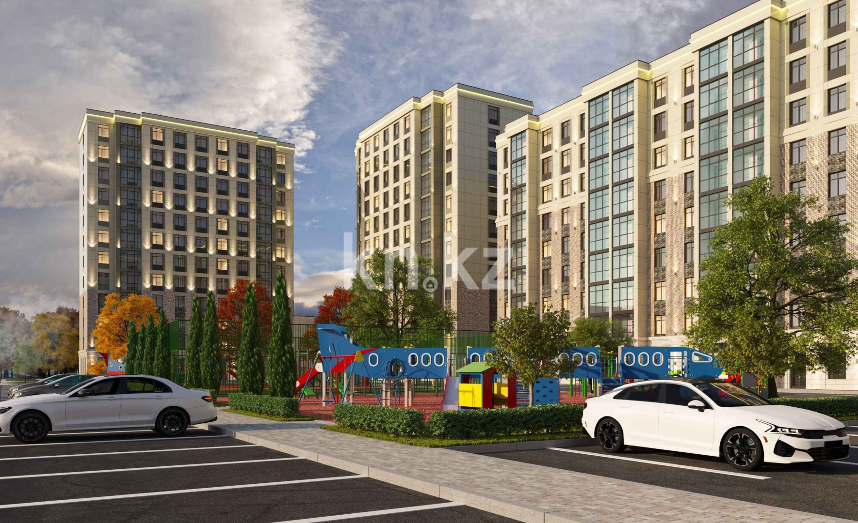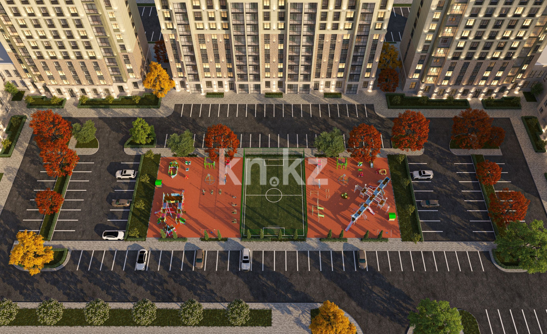 Комфортабельный двор, разделенный на три возрастных категории, ландшафтный дизайн, воркаут зона, и безопасные конструкции для подрастающего поколения. Здесь предусмотрены зеленые аллеи с фонтанами, беседки-качели, детские площадки, футбольные поля и многое другое.