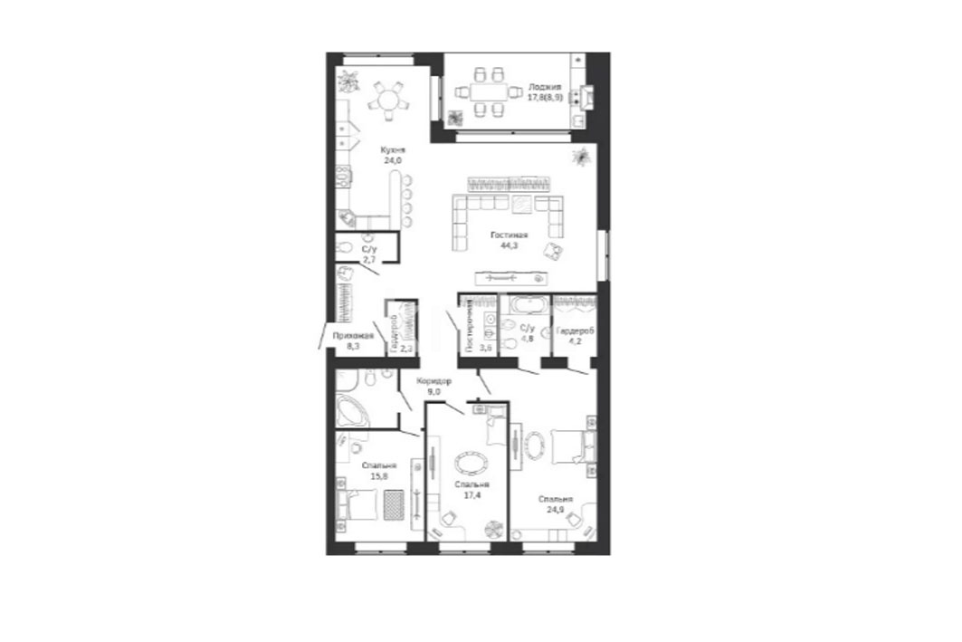 Клубный дом состоит всего из 13 квартир площадью от 130 до 200 квадратных метров. В квартирах установлены панорамные, мультифункциональные стеклопакеты. Каждая квартира оборудована лоджией площадью 30 квадратных метров, с зоной барбекю.