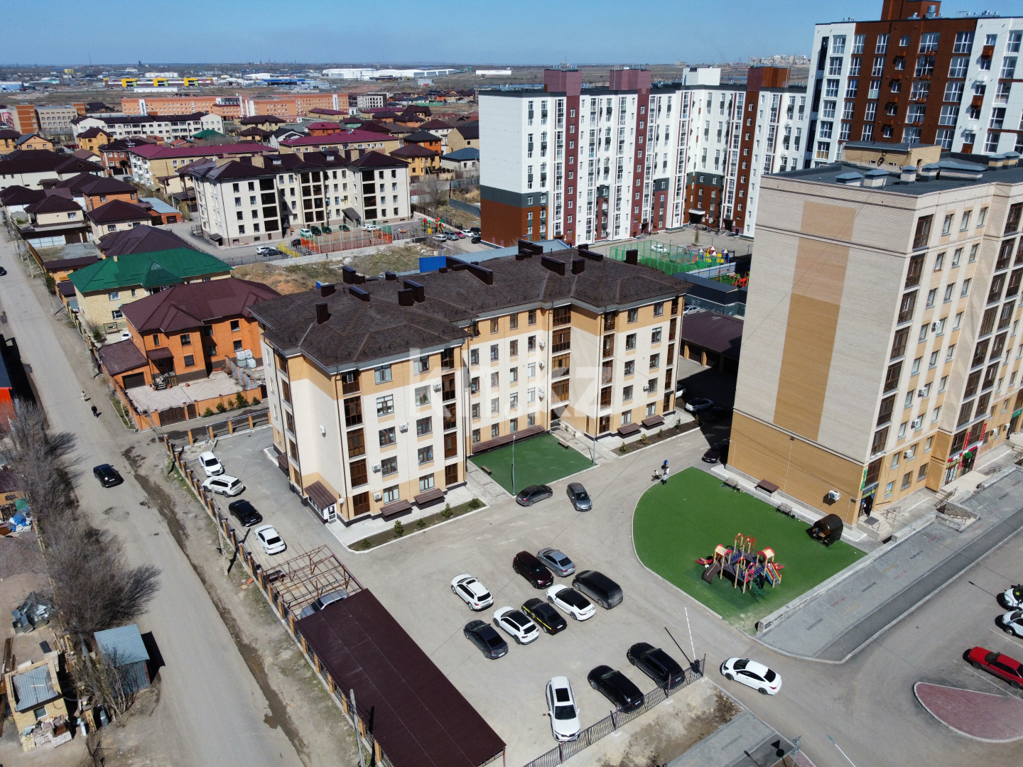 Оборудован спортивной площадкой с безопасным полиуретановым покрытием и тренажерами, огороженной детской игровой площадкой с покрытием искуственной травой. Газоны, предусмотрена посадка деревьев и кустарников.