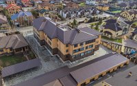 Территория полностью огорожена забором, имеются крытые парковочные места, детская площадка.