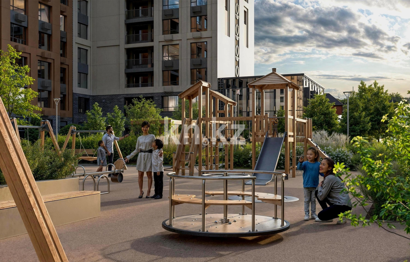 • современные детские площадки из экологичных материалов;