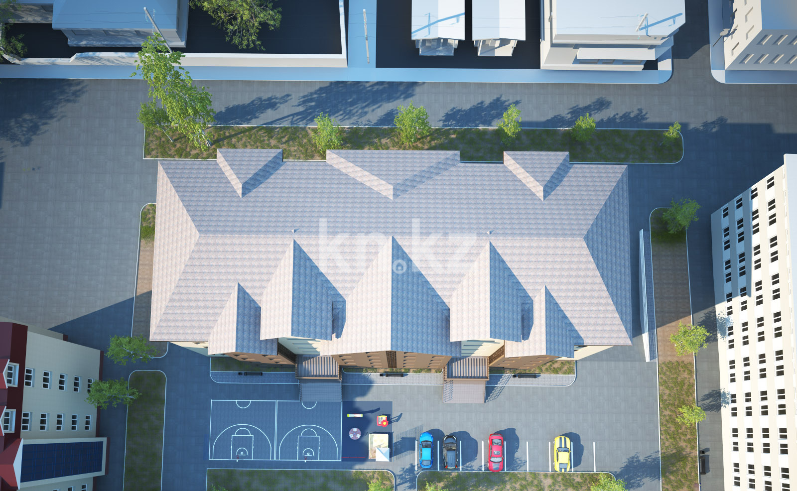 оборудованы: детская игровая зона и спортивные площадки для занятий игровыми видами спорта.